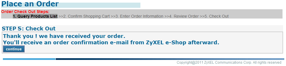 Well done! You finished placing an order. A message will show as the picture below. You will receive an order confirmation email 15 minutes later. You can click on the "Continue" button to bring you back to the welcome page.