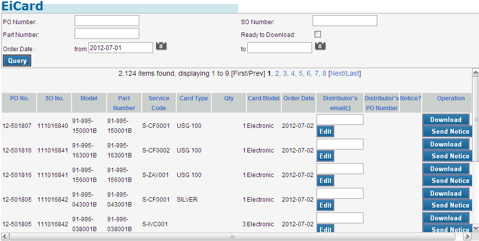 2. You will see the search form as the picture below that you can search by customer PO Number, SO Number , Part Number , Ready to Download , Order Date.