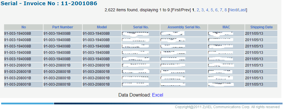The system can export this data table to a Excel file as you wish. Please click on the "Excel" link under the data table to open a message window and click on "Save" to save it on your local computer. You also can view details information of "Serial(Firmware)", "Invoice", "Packing" or "Shipping" by clicking the button under the "Operation" column of the line. If there is no data to show, the button will be disabled. If a button is clickable, a new window will open to show the information. When you are done with viewing the information, please click on the "X" on the browser to close the window.