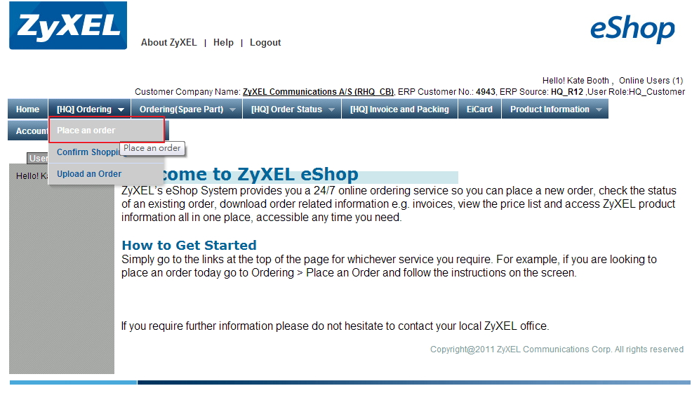 Please find and click on the "Place an Order" options under "Ordering" tab on menu bar.